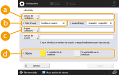 Puede configurar las condiciones detalladas para retener trabajos de la impresora, como el usuario o la dirección IP. Si no se configura ninguna condición, se retendrán todos los trabajos de impresión, salvo los trabajos de usuarios no identificados. Si no se establece ninguna condición y se recibe un trabajo de impresión de un usuario no identificado, el trabajo se cancelará sin ser retenido.