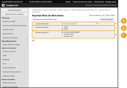 Puede seleccionar opciones concretas para importar o exportar, como listas de direcciones de la Libreta de direcciones u opciones de la impresora. Para realizar estas operaciones tiene que iniciar una sesión con privilegios de Administrador.