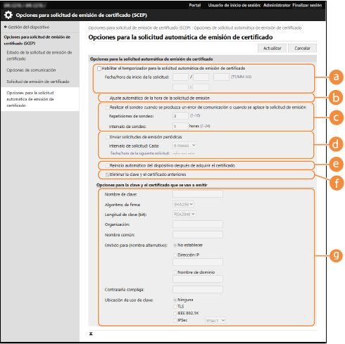 Puede enviarse una solicitud para emitir el certificado necesario para las claves generadas con el equipo a un servidor SCEP (Protocolo de inscripción de certificado simple) que gestione los certificados. Los certificados emitidos desde un servidor SCEP se registran automáticamente en el equipo. Se requieren privilegios de Administrator para enviar una solicitud para emitir un certificado.