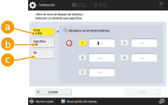 <Hora de inicio de bloqueo de memoria> | <Todos los días> (de 1 a 5), <Especificar días> (de <Dom> a <Sáb>, de 1 a 5), <No> | Sí | No | Sí | Sí | C | Información básica de configuración |