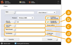 1 | Introduïu el nom d'amfitrió del servidor de fitxers/Espai avançat que transmet les dades. ![]() Demaneu a l'administrador de xarxa la informació sobre el servidor de fitxers/Espai avançat. <Protocol>Seleccioneu un protocol per al servidor de fitxers entre <Windows (SMB)>, <FTP> i <WebDAV>. Si envieu un document a Espai avançat, seleccioneu <Windows (SMB)> o <WebDAV>. ![]() Si seleccioneu <Windows (SMB)>, es mostren els botons <Cercar amfitrió> i <Examinar>. Per especificar fàcilment un servidor de fitxers/Espai avançat, cerqueu o visualitzeu la xarxa. Només podeu utilitzar <Examinar> si <1.0> està configurat com <On> en <Especificar versió del client SMB>. Podeu registrar un màxim de cinc servidors de directoris a <Examinar>. <Nom de l'amfitrió>Introduïu el nom de l'amfitrió del servidor de fitxers/Espai avançat. Si seleccioneu <FTP> per al protocol, introduïu el <Nom de l'amfitrió> com s'indica a continuació. Si TLS està desactivat Exemple: Per desar a l'espai compartit: ftp://nom d'amfitrió/share Per desar a l'espai personal: ftp://nom d'amfitrió/users Si TLS està activat Exemple: Per desar a l'espai compartit: ftps://nom d'amfitrió/share Per desar a l'espai compartit: ftps://nom d'amfitrió/users Si envieu un document a Espai avançat, introduïu el <Nom de l'amfitrió> de la següent manera. Si seleccioneu <Windows (SMB)> per al protocol Exemple: Per desar a l'espai compartit: \\192.168.100.50\share Per desar a l'espai personal: \\192.168.100.50\users Si seleccioneu <WebDAV> per al protocol Si TLS està desactivat Exemple: Per desar a l'espai compartit: http://<adreça IP o nom d'amfitrió> Per desar a l'espai personal: http://<adreça IP o nom d'amfitrió> Si TLS està activat Exemple: Per desar a l'espai compartit: https://<adreça IP o nom d'amfitrió> Per desar a l'espai personal: https://<adreça IP o nom d'amfitrió> <Comproveu connexió>Premeu aquest botó després d'introduir el nom d'amfitrió per confirmar la connexió amb el servidor de fitxers/Espai avançat. ![]() Si utilitzeu un servei d'inici de sessió, com ara la gestió d'autenticació personal, cal introduir els valors <Nom d'usuari> i <Contrasenya>. |