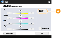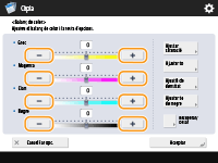 Podeu desar fins a quatre opcions després de l'ajustament. Un cop ajustat el color, premeu <Recuperar/Desar>  seleccioneu un botó de <C1> a <C4>  premeu <Desar>  <Sí>  <Bé>. Per recuperar les opcions desades, premeu <Recuperar/Desar>, seleccioneu un botó i premeu <Bé>. Podeu canviar els noms dels botons de <C1> a <C4>. Seleccioneu el botó que voleu canviar, premeu <Canviar nom> i introduïu un nom nou. Per eliminar opcions desades, seleccioneu el botó  premeu <Eliminar>  <Sí>. |
