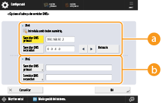 2 | Configureu les opcions necessàries. Segons el vostre entorn, introduïu una adreça IP del servidor DNS. ![]() Per obtenir més informació sobre les opcions, poseu-vos en contacte amb el vostre administrador de xarxa o el vostre proveïdor. ![]() <IPv4>Premeu <Servidor DNS primari> i introduïu una adreça IPv4 del servidor DNS. Si hi ha un servidor DNS secundari, introduïu-ne l'adreça IP. Si no establiu un servidor DNS secundari, introduïu "0.0.0.0". <IPv6>Premeu <Servidor DNS primari> i introduïu una adreça IPv6 del servidor DNS. No podeu introduir adreces que comencen amb "ff" (adreça multidifusió), adreces que només continguin "0" ni o adreces d'enllaç local. Si hi ha un servidor DNS secundari, introduïu-ne l'adreça IP. No podeu introduir adreces que comencen amb "ff" (adreça multidifusió), adreces que només continguin "0" ni o adreces d'enllaç local. Aquesta columna es pot deixar en blanc. |