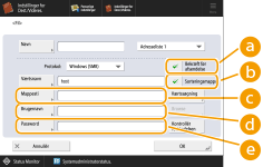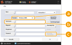1 | Indtast hostnavnet på den filserverx/Avanceret område, der sender data. ![]() Spørg din netværksadministrator om flere informationer om filserveren/Avanceret område. <Protokol>Vælg en protokol til filserveren fra <Windows (SMB)>, <FTP> og <WebDAV>. Når du sender et dokument til Avanceret område, skal du vælge <Windows (SMB)> eller <WebDAV>. ![]() Hvis du vælger <Windows (SMB)>, vises knapperne <Værtssøgning> og <Browse>. Du kan nemt angive en filserver/Avanceret område ved at søge på eller vise netværket. Du kan kun bruge <Browse>, hvis <1,0> er indstillet til <Til> i <Angiv SMB-klientversion>. Du kan registrere op til fem Directory-servere, der bruges, i <Browse>. <Værtsnavn>Indtast hostnavnet for filserveren/Avanceret område. Hvis du vælger <FTP> for protokollen, skal du angive <Værtsnavn> på følgende måde. Når TLS er deaktiveret Eksempel: Sådan gemmer du i delt område: ftp://værtsnavn/share Sådan gemmer du i personligt område: ftp://værtsnavn/users Når TLS er aktiveret Eksempel: Sådan gemmer du i delt område: ftps://værtsnavn/share Sådan gemmer du i personligt område: ftps://værtsnavn/users Når du sender et dokument til Avanceret område, skal du angive <Værtsnavn> på følgende måde. Hvis du vælger <Windows (SMB)> for protokollen Eksempel: For at gemme i delt område: \\192.168.100.50\share For at gemme i Personligt område: \\192.168.100.50\users Hvis du vælger <WebDAV> for protokollen Når TLS er deaktiveret Eksempel: Sådan gemmer du i delt område: http://<IP-adresse eller værtsnavn> Sådan gemmer du i personligt område: http://<IP-adresse eller værtsnavn> Når TLS er aktiveret Eksempel: Sådan gemmer du i delt område: https://<IP-adresse eller værtsnavn> Sådan gemmer du i personligt område: https://<IP-adresse eller værtsnavn> <Kontrollér forbindelsen>Tryk på denne knap, når du har indtastet hostnavnet, for at bekræfte forbindelsen med filserveren/Avanceret område. ![]() Hvis du bruger en login-tjeneste som f.eks. personlig godkendelsesadministration, skal du angive <Brugernavn> og <Password>. |