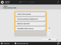 Jotta voit käyttää omia asetuksia, sinun on kirjauduttava sisään henkilökohtaisen todentamisen hallinnalla. Käyttäjien hallintaKäytettävissä olevat asetuksetAlla luetellut asetukset voidaan määrittää. Kosketusnäytön kieli Käytettävyystoiminnot käyttäjille, joiden on vaikeaa nähdä tai suorittaa syöttötoimintoja kosketusnäytössä Oma tukiasema (oma SSID/verkkoavain) Töiden tulostaminen automaattisesti sisäänkirjautumisen jälkeen |