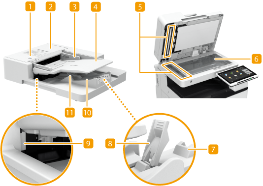 Tähän asetetut alkuperäiset asiakirjat syötetään automaattisesti syöttölaitteeseen. Jos vähintään kaksi arkkia on lisätty, ne voidaan skannata peräkkäin.