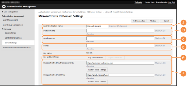 3 | Määritä Microsoft Entra ID -tiedot. ![]() [Login Destination Name]Anna kirjautumiskohteessa näytettävä nimi. * Tässä ei voi käyttää ohjausmerkkejä eikä välilyöntejä. [Domain Name]Anna kirjautumiskohteena olevan Microsoft Entra ID -toimialueen nimi. [Application ID]Anna sovellustunnus (asiakassovelluksen). [Secret] Anna Microsoft Entra ID -hakemiston tuottama salaisuus. Tätä ei tarvitse antaa, kun käytössä on [Avain ja varmenne]. [Avain ja varmenne]Paina [Avain ja varmenne], kun käytät avainta ja varmennetta. Voit viedä Microsoft Entra ID -hakemistoon rekisteröitävän varmenteen painamalla [Export Certificate]. [Microsoft Entra ID Authentication URL] ja [Microsoft Entra ID API URL]Anna URL-osoitteet. Joissakin pilvipalveluympäristöissä asetusta voi joutua muuttamaan. |