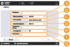 3 | Aseta yhteisö. ![]() <Nimetty yhteisö>/<Yhteisönimi 1>/<Yhteisönimi 2>Käytä valittua yhteisöä valitsemalla <Kyllä>. Jos et halua käyttää yhteisöä, valitse <Ei>. <MIB pääsyoikeudet>Valitse kullekin yhteisölle MIB-käyttöoikeudet kohdassa <Luku/Kirj.> tai <Vain luku>. <Yhteisönimi>Kirjoita yhteisösi nimi aakkosnumeerisilla merkeillä. Jos valitset <Aseta nimetty yhteisö>, et voi määrittää erityistä yhteisönimeä. |