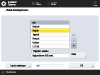 Valitse kieli, jota käytetään näytöissä. Voit vaihtaa merkkien kirjoittamiseen käytettävän näppäimistön asettelua kielen mukaan. ![]() ![]() Valitse kieli ja valitse sitten <OK>. Muuta näppäimistön asettelua painamalla kohtaa <Aseta> ja valitsemalla näppäimistön asettelu ja <OK>. Kielen vaihto -painike on kätevä, jos kieltä vaihdetaan usein. Näytön kielen vaihtaminen | |
