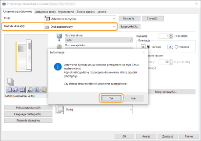 ![]() | Można ustawić czas rozpoczęcia drukowania, co jest przydatne przy drukowaniu dużych ilości dokumentów w nocy itp. |