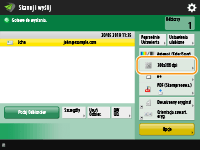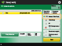 Sprawdzanie całkowitej liczby określonych odbiorcówCałkowita liczba określonych odbiorców jest wyświetlana w prawym górnym rogu ekranu. Umożliwia to potwierdzenie przed wysłaniem, czy liczba odbiorców jest prawidłowa. ![]() Aby natychmiast anulować wysyłane zadanieJeżeli podczas wysyłania zadania naciśniesz przycisk (Stop) na panelu sterowania, wyświetlony zostanie komunikat <Anulować wybrane zadania wysyłania?>. Naciśnij na <Tak>, aby anulować wysyłanie.Można wybrać <Ostatnio odeb. zadania> lub <Wysłano zadanie>, by wybrać zadanie do anulowania. <Zadanie do anulowania po naciśnięciu stop> Gdy jest wiele zadań wysyłania, naciśnij przycisk (Stop), aby wyświetlić ekran pozwalający anulować zadanie wysyłania. Jeżeli zadanie wysyłania, które chcesz anulować, nie jest wyświetlone, naciśnij <Sprawdź inne zadania>, aby wyświetlić <Zadania wysyłania>. Wybierz zadanie, które chcesz anulować, i naciśnij przycisk <Anuluj>.Sprawdzanie statusów wysłanych/zapisanych dokumentówNa ekranie <Monitor stanu>, możesz sprawdzić statusy wysłanych/zapisanych dokumentów. Ten ekran umożliwia ponowne wysyłanie/zapisanie dokumentów lub anulowanie ich wysyłania/zapisywania po sprawdzeniu ich statusów. Sprawdzanie statusu i rejestru zeskanowanych dokumentów Jeżeli dla opcji <Wyświetl powiado. gdy zadanie zostało zaakceptowa.> wybrano ustawienie <Włącz>, ekran <Monitor stanu> można wyświetlić z poziomu poniższego ekranu wyświetlanego po odebraniu wysłanego zadania. <Wyświetl powiado. gdy zadanie zostało zaakceptowa.> ![]() Drukowanie raportu wyników wysyłania/zapisywaniaNa ekranie Podstawowe funkcje skanowania, naciśnięcie kolejno elementów <Opcje> <Raport TX> umożliwia ustawienie automatycznego drukowania raportu z listą wyników wysyłania/zapisywania.By ustawić to dla każdego zadania z <Opcje>, należy wybrać <Tylko dla Błędu> lub <Wyłącz> w <Raport TX>, a następnie ustawić <Zezwól na drukowanie z opcji> na <Włącz>. Nazwa plikuGdy plik jest wysyłany/zapisywany, jego nazwa zostaje utworzona automatycznie, zgodnie z poniższym formatem. Możesz zmienić te ustawienia tak, aby przypisać inną nazwę. Ustawianie nazwy pliku Podczas wysyłania wiadomości e-mail Numery zadania (cztery cyfry)_numery stron (trzy cyfry).rozszerzenie pliku, np. „1042_001.jpg” Podczas zapisywania na serwerze plików Rok, miesiąc, dzień, godzina, minuta i sekunda zapisania pliku (14 cyfr).rozszerzenie pliku, np. 20151030133541.jpg Temat wiadomości e-mailTemat wprowadzony w polu <Domyślny temat> jest ustawiany automatycznie (<Domyślny temat>). Jeżeli określisz inny temat, zmień ustawienia lub określ czas wysyłania wiadomości e-mail (Określanie ustawień poczty e-mail). Jeżeli podawanych jest wiele arkuszySkanowanie zostaje zatrzymane, a na ekranie zostanie wyświetlony komunikat. Postępuj zgodnie z instrukcjami, aby usunąć zacięcie. Po usunięciu zacięcia zostanie wyświetlony ekran wznawiania zadania. Jeśli urządzenie omyłkowo wykryje podanie kilku arkuszy, naciśnij <Nie wykrywaj pod. wielofunk.>, aby wznowić skanowanie. Aby wcześniej ustawić urządzenie tak, aby nie powiadamiało o podaniu kilku arkuszy, należy wykonać jedną z poniższych czynności. Przy każdym wysyłaniu/zapisywaniu dokumentu naciśnij <Opcje> na ekranie Podstawowe funkcje skanowania wybierz <Wykryj podajnik pod. wielofunk.>, aby wyłączyć to ustawienie.Dla <Ust. wykry. podaj. poda. wielu rodz. ark. jako domyśl.> ustaw <Wyłącz>. <Ust. wykry. podaj. poda. wielu rodz. ark. jako domyśl.> |