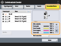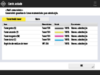 <Dias restantes> apresenta o número previsto de dias restantes até ser necessária a substituição, com base na utilização anterior. Mesmo que <Necess. substituição> seja apresentado em <Dias restantes>, não proceda à substituição até ser apresentada uma mensagem a solicitar a substituição dos consumíveis na área de apresentação (no fundo do painel digital). A medição dos <Dias restantes> não completa até depois da máquina iniciar a operação e <1 ano ou mais> ser apresentado entretanto. Os dias restantes apresentados após este período podem ser extremamente reduzidos. |