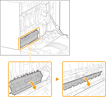 ![]() | Abra a guia da unidade de fixação. Se existir papel encravado, puxe-o para fora cuidadosamente na direção da seta. ![]() ![]() Se o papel estiver parcialmente de fora na parte inferior (lado de entrada) da unidade de fixação, puxe o papel para fora e para baixo cuidadosamente. |