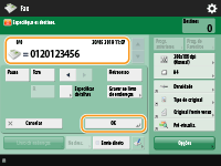 Para verificar o número total de destinos especificadosO número total de destinos especificados é apresentado na parte superior direita do ecrã. Isto permite-lhe confirmar se o número de destinos está correto antes do envio. ![]() Para enviar com as informações do remetenteÉ possível proceder ao envio com o nome e o número de fax do remetente. <ID do terminal de TR.> Para verificar os estados dos documentos enviadosNo ecrã <Contr. estado>, pode verificar os estados dos documentos enviados. Este ecrã permite enviar faxes novamente ou cancelar o envio após a verificação dos estados. Verificar o estado e o registo de documentos enviados e recebidos Se o item <Mostrar notificação quando trabalho for aceite> for programado para <On>, é possível aceder ao ecrã <Contr. estado> a partir do ecrã seguinte que é mostrado após a receção de um trabalho de envio. <Mostrar notificação quando trabalho for aceite> ![]() Se ocorrer um erro de transmissão devido ao facto de a linha do destinatário estar ocupadaA máquina remarca automaticamente após um determinado período de tempo. É possível alterar as programações como, por exemplo, o número de vezes de remarcação da máquina e o intervalo entre remarcações. <Remarcação automática> Para imprimir o relatório dos resultados de envioNo ecrã das funções básicas de fax, carregar em <Opções> <Relatório TR.> permite programar a impressão automática do relatório com os resultados de envio.Para programar isto para cada trabalho em <Opções>, tem de selecionar <Só para erros> ou <Desligado> em <Relatório TR.> e, em seguida, programar <Permitir a partir de Opções> como <Ligado>. Quando são alimentadas várias folhasA leitura é interrompida e a mensagem é apresentada no ecrã. Siga as instruções para retirar o papel encravado. Quando tiver retirado o papel encravado, o ecrã para retomar o trabalho é apresentado. Se a máquina detetar incorretamente a alimentação de várias folhas, carregue em <Não detetar alim. várias folhas> para retomar a leitura. Para programar a máquina antecipadamente para não o notificar da alimentação de várias folhas, efetue uma das operações seguintes. Sempre que enviar, carregue em <Opções> no ecrã das funções básicas de fax selecione <Detet. ali. vár. folh. aliment.> para desativar a programação. Defina <Pré-prog. deteção alim. várias folhas alimentador> como <Desligado>. <Pré-prog. deteção alim. várias folhas alimentador> Quando as fotografias na imagem enviada são muito escuras ou não é possível remover cores claras no fundo de originais a coresÉ possível melhorar a qualidade da imagem enviada se as condições/programações seguintes forem satisfeitas. Tipo de trabalho: Fax (Envio a partir da memória) ou Ler e Enviar (Fax/I-fax) <Selecionar cor>: <Preto e branco> (Ler e Enviar) <Tipo de original>: <Texto> <Densidade> <Densidade do fundo>: <Auto><Resolução>: 200 dpi x 400 dpi, 300 dpi x 300 dpi*, 400 dpi x 400 dpi ou 600 dpi x 600 dpi* *Pode ser programado para Ler e Enviar <Prior. veloc./qualid. img. p/Leitura P/B> Tbs envio fax/I-fax: <Prioridade qualidade> (<Prior. veloc./qualid. img. p/Leitura P/B>)Quando estão programadas várias linhas de telefonePode selecionar a linha telefónica a utilizar para enviar faxes carregando em <Opções> <Selecionar linha>. Para obter instruções sobre como especificar as programações de linhas de fax, consulte Programações da linha de fax. |