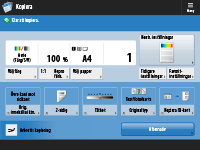 Tryck på som visas på skärmen <Hem> och skärmbilden med grundläggande funktioner för att anpassa den genom att t.ex. flytta på knappar eller skapa genvägsknappar. Anpassa pekskärmen![]() Du kan ändra inställningarna för skärmbildsvisningen, som t.ex. vilken skärmbild som visas när du slår på maskinen och om meddelandet för återstående papper och toner ska visas. <Visa inställningar> Du kan ställa in vilken skärmbild som ska visas när en viss tid har passerat utan åtgärd. <Funktion efter autoåterställning> |
