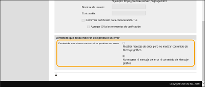 En [Contenido que desea mostrar si se produce un error], seleccione [No mostrar ni mensaje de error ni contenido de Mensaje gráfico].