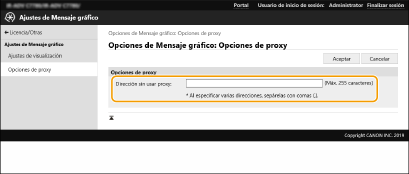 Especifique en la función Mensaje visual las mismas opciones de proxy configuradas en <Opciones de proxy>. Si se configura un proxy, es posible que el contenido especificado no aparezca. En tal caso, puede configurar una dirección excluida para que el servidor proxy no se utilice.