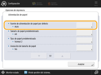 <Fuente de alimentación de papel por defecto> | <Auto>, <Bandeja MU>, <Cajón 1> en <Casete X>* | Sí | Sí | Sí | No | B | Opciones de opciones de impresora |