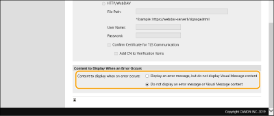 Selecteer in [Content to Display When an Error Occurs] [Do not display an error message or Visual Message content].