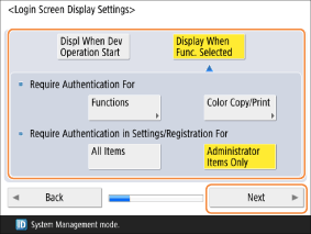 <Display When Func. Selected>: Select this to display the login screen when a user is using a function such as the copy function. You can select whether to perform authentication for each function.