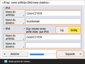 <Usar mesmo nome anfitr./dom. que IPv4>: Defina isto para <Ligado> para aplicar as mesmas configurações de IPv4 em IPv6.