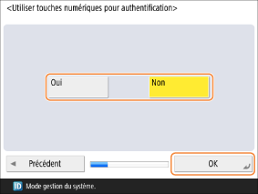 Si vous sélectionnez <Oui>, le nom d'utilisateur et le mot de passe ne peuvent être saisis qu'à l'aide des touches numériques.