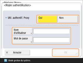 <Util. authentif. Proxy> : Pour utiliser l'authentification proxy, réglez ce paramètre sur <Oui> et entrez des valeurs dans <Nom d'utilisateur> et <Mot de passe>.