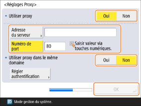 <Utiliser proxy> : Pour vous connecter en externe via un serveur proxy, réglez ce paramètre sur <Oui> et entrez les valeurs dans <Adresse du serveur> et <Numéro de port>.