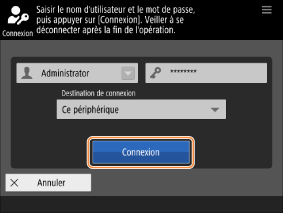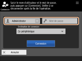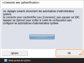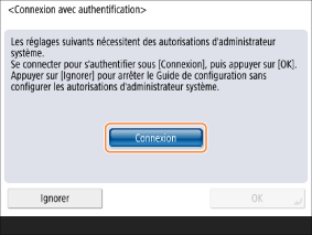 Les privilèges d'administrateur sont requis pour les réglages suivants. Si vous souhaitez configurer les paramètres, appuyez sur <Connexion>.