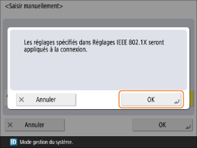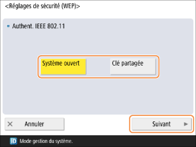 Lorsque l'authentification par clé partagée est activée sur le routeur réseau local sans fil, vous ne pouvez pas vous connecter avec <Système ouvert> sélectionné. Si vous avez sélectionné <Système ouvert>, le réglage passe automatiquement à <Clé partagée> et la reconnexion est effectuée.
