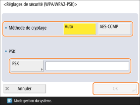 Sélectionnez <Méthode de cryptage>, entrez la clé dans <PSK>, et appuyez sur <OK>.