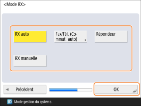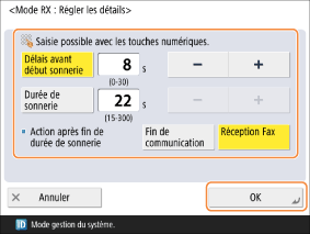 <Action après fin de durée de sonnerie> : Sélectionnez l'opération effectuée par la machine si le combiné n'est pas décroché pendant la sonnerie. Sélectionnez <Fin de communication> pour déconnecter ou <Réception Fax> pour recevoir le fax.