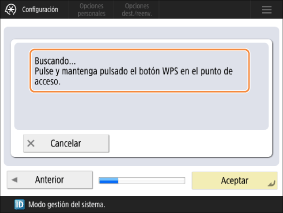Cuando aparezca <Buscando... Pulse y mantenga pulsado el botón WPS en el punto de acceso.>, mantenga pulsado el botón WPS del enrutador de la red inalámbrica antes de que transcurran dos minutos.