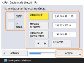 Para introducir manualmente la dirección IP, confirme que <DHCP> y <IP autom.> no están seleccionados e introduzca valores para <Dirección IP>, <Máscara de subred> y <Dirección de puerta enlace>.