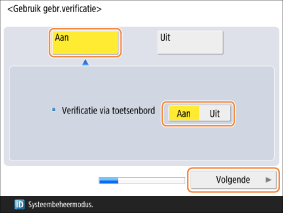 Controleer of <Gebruik gebr.verificatie> en <Verificatie via toetsenbord> zijn ingesteld op <Aan> en druk op <Volgende> om gebruikersverificatie te gebruiken.