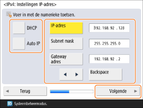 Als u het IP-adres handmatig wilt invoeren, controleert u of <DHCP> en <Auto IP> niet zijn geselecteerd en voert u waarden in voor <IP-adres>, <Subnet mask> en <Gateway adres>.