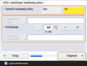 Stel <Gebruik handmatig adres> in op <Aan> wanneer u een handmatig adres gebruikt en voer waarden in voor <Handmatig adres>, <Prefixlengte> en <Standaardrouteradres>.