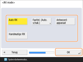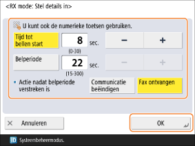 <Actie nadat belperiode verstreken is>: Selecteer de bewerking voor de machine die moet worden uitgevoerd als de handset niet wordt opgenomen terwijl de machine rinkelt. Selecteer <Communicatie beëindigen> om de verbinding te verbreken of <Fax ontvangen> om de fax te ontvangen.