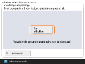 Druk op <Start afdrukken> om Proefpagina 2 af te drukken. Verwijder Proefpagina 1 van de glasplaat, omdat deze niet wordt gebruikt in de volgende stappen.