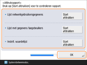 Druk op <Start afdrukken> voor het te controleren rapport en druk op <OK> wanneer het afdrukken is voltooid.