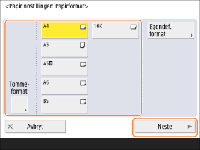 Velg papirformatet og trykk på <Neste>.