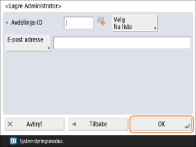 <E-post adresse>: Denne adressen er angitt som mottaker for <Send til meg selv> i <Skanne og sende>.