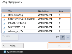 Velg SSID-en til den trådløse LAN-ruteren du vil koble til, og trykk på <OK>.