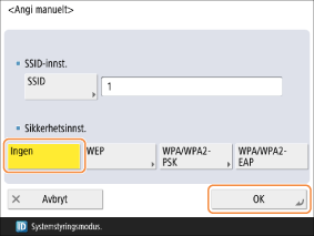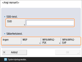 Tast inn SSID-en for den trådløse LAN-ruteren som du skal koble til, og velg sikkerhetsinnstillingene.