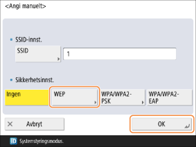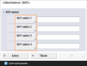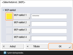Velg en av <WEP-nøkkel 1> til <WEP-nøkkel 4>, og tast inn WEP-nøkkelen.