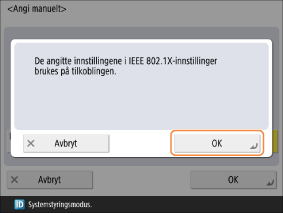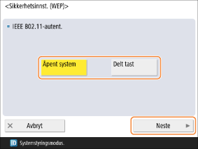 Når delt nøkkelautentisering er angitt på den trådløse LAN-ruteren, kan du ikke koble til når <Åpent system> er valgt. Hvis du valgte <Åpent system>, endres innstillingen automatisk til <Delt tast> og tilkobling utføres på nytt.