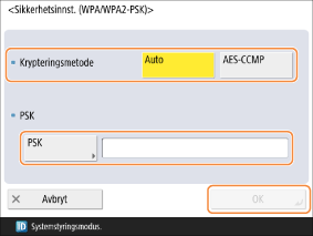 Velg <Krypteringsmetode>, tast inn nøkkelen i <PSK> og trykk på <OK>.