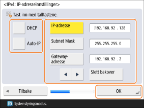 For å taste inn IP-adressen manuelt bekrefter du at <DHCP> og <Auto-IP> ikke er valgt, og angir verdier for <IP-adresse>, <Subnet Mask> og <Gatewayadresse>.