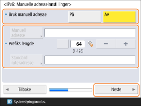 Når du bruker en manuell adresse, angir du <Bruk manuell adresse> som <På>, og angir verdier for <Manuell adresse>, <Prefiks lengde> og <Standard ruteradresse>.