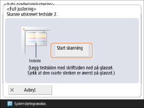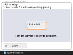 Trykk på <Start utskrift> for å skrive ut testside 2. Fjern testside 1 fra glassplaten, da den ikke brukes i de påfølgende trinnene.